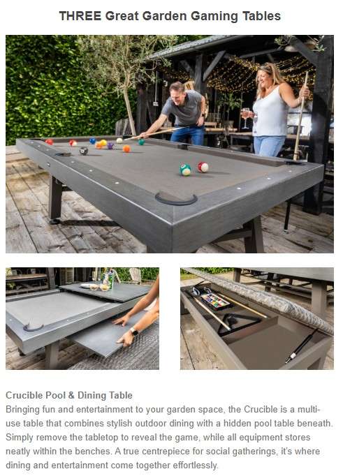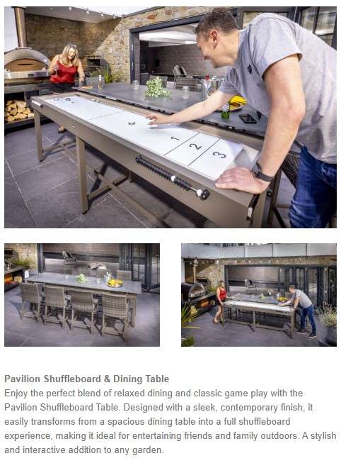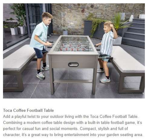 We’re also bringing the fun outdoors with our fantastic selection of garden games, including the innovative Crucible pool dining table, Pavilion shuffleboards, and the ever-popular TOCA table football – perfect for entertaining family and friends.